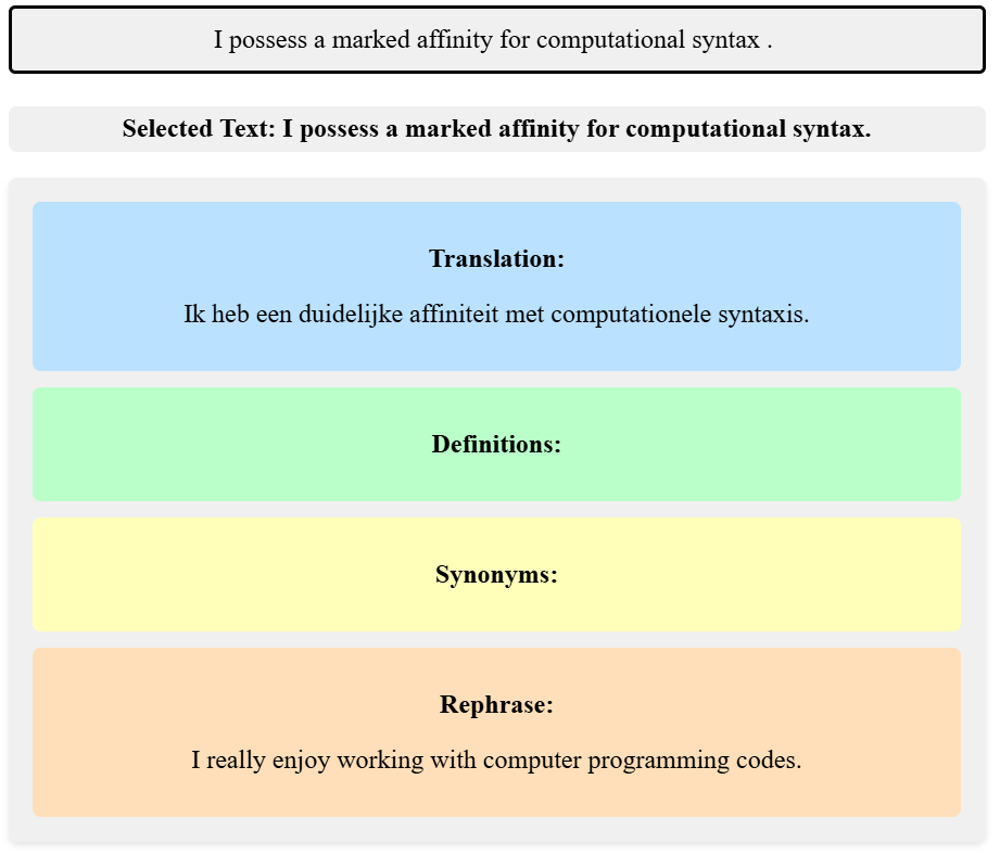Right: sentence-level additional functionalities, such as translation (here into dutch) or simplified rephrasing.